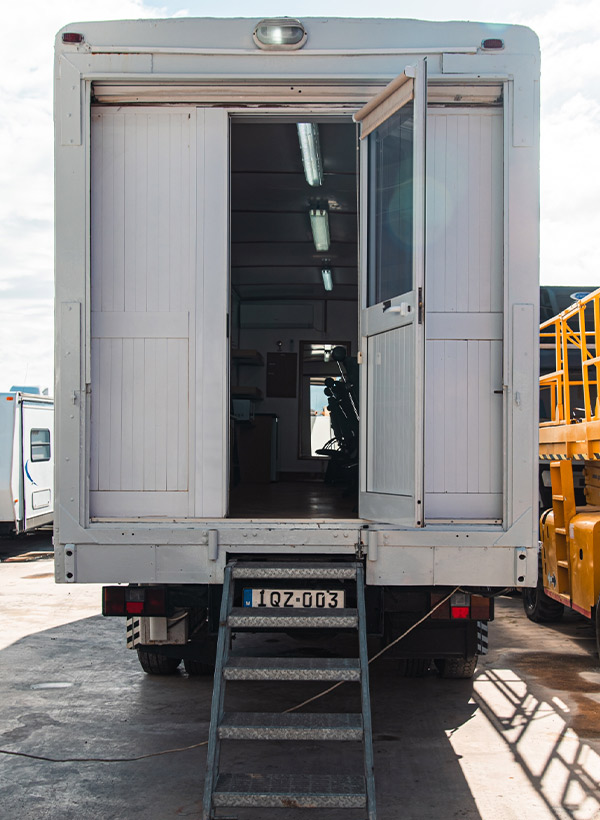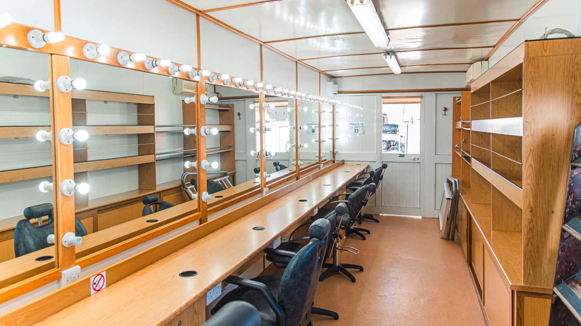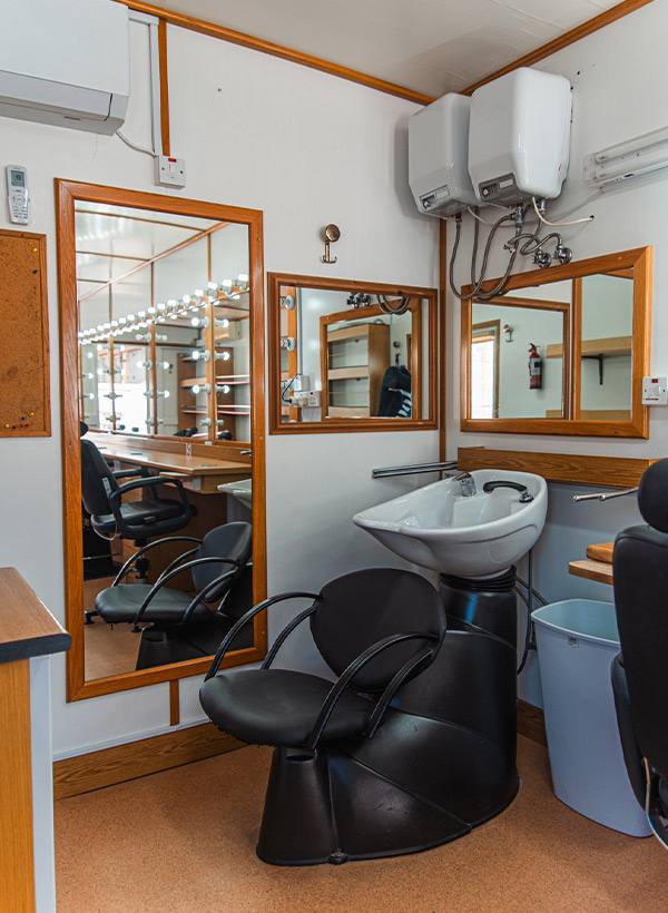 With its wide entrance and rear staircase access, this rigid truck provides a clean, organised and comfortable workspace, ideal for cast preparation, makeup teams and hair stylists working in the field.
