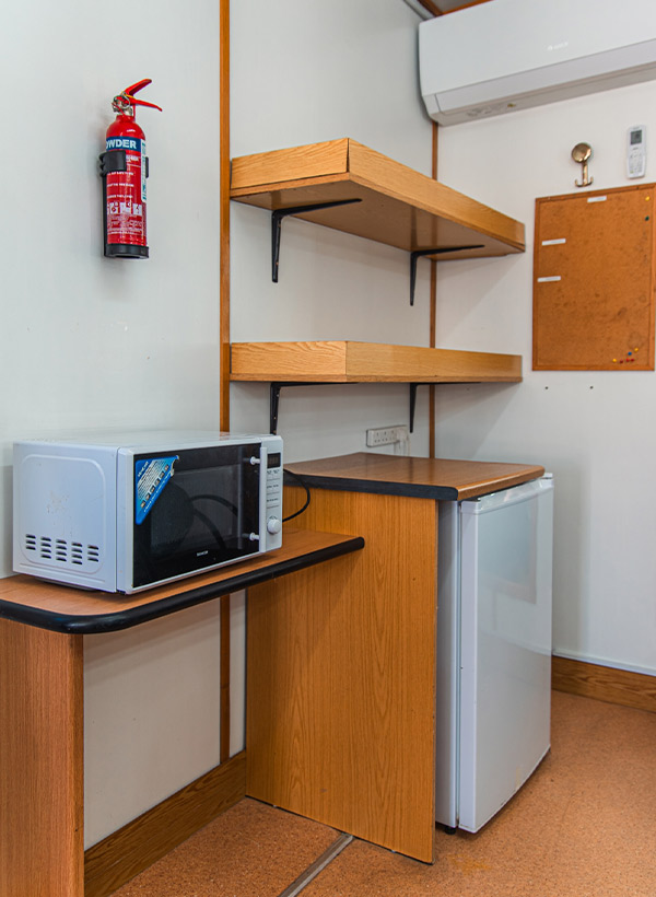 The dedicated hair-washing station, complete with a salon basin and comfortable seating, ensures seamless hairstyling work. Additional conveniences include air-conditioning, a refrigerator, microwave, useful work surfaces and plenty of power outlets for tools and appliances.