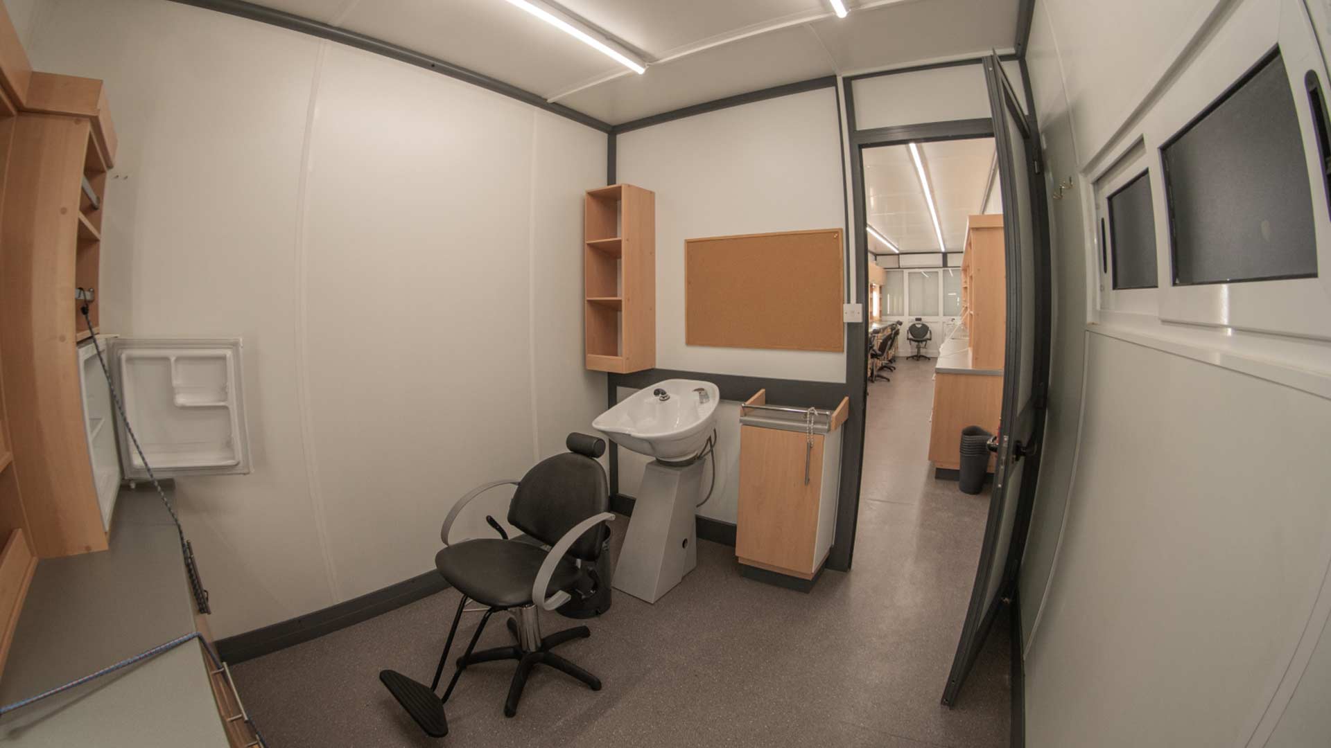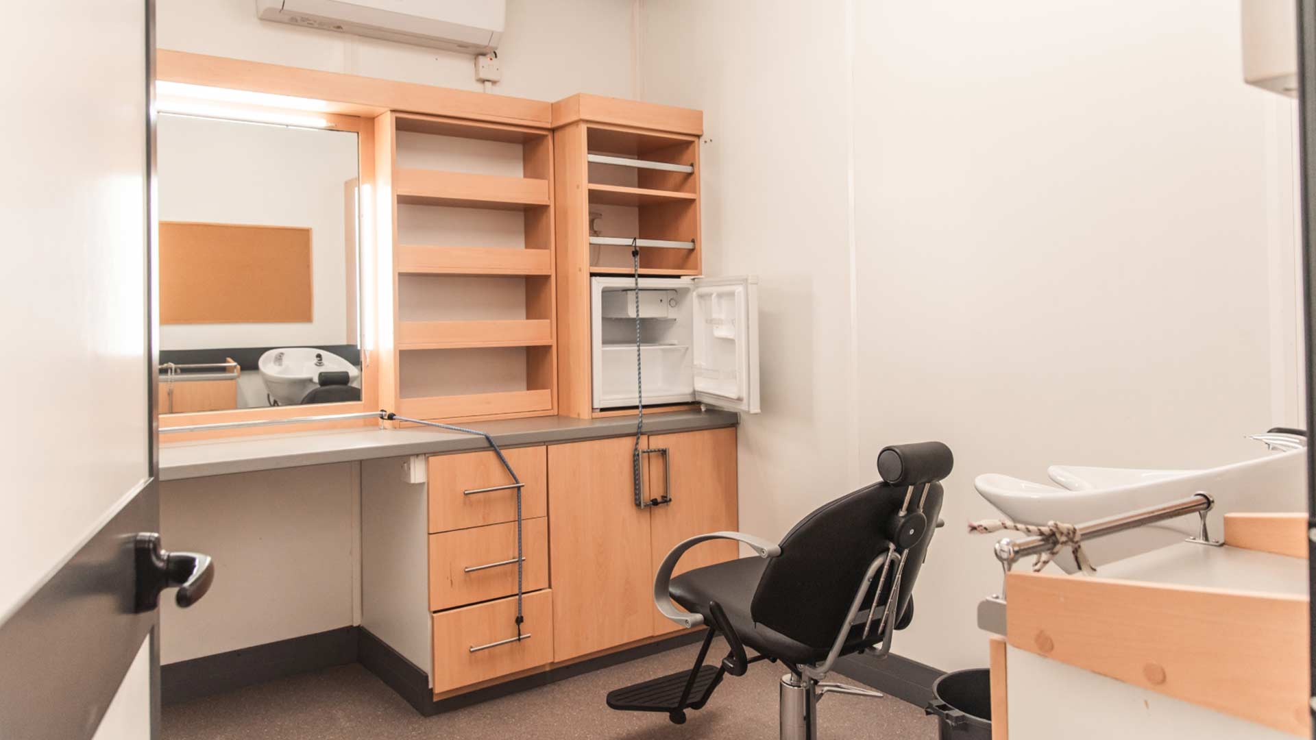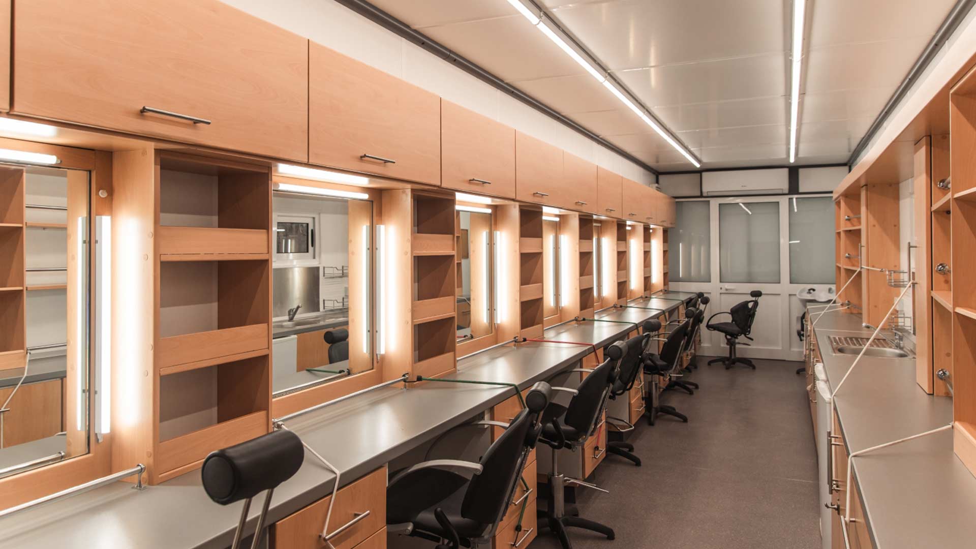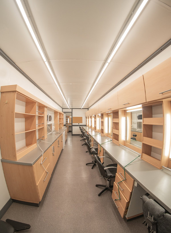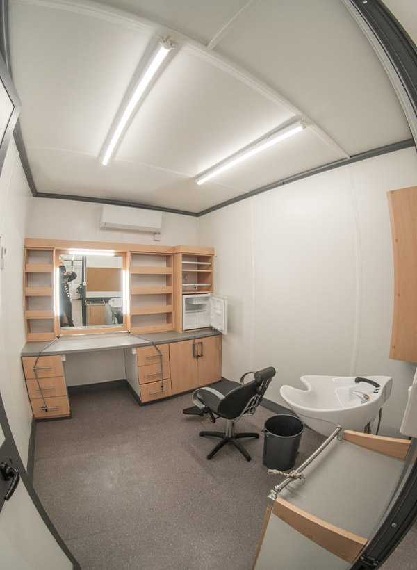The Artic 8-Position Makeup Trailer is built to support larger makeup departments with a spacious, bright, and fully equipped working environment. Featuring eight wide, illuminated makeup stations, extensive shelving, under-counter storage, air-conditioning and ergonomic chairs, it provides everything needed for fast, efficient on-set preparation.
