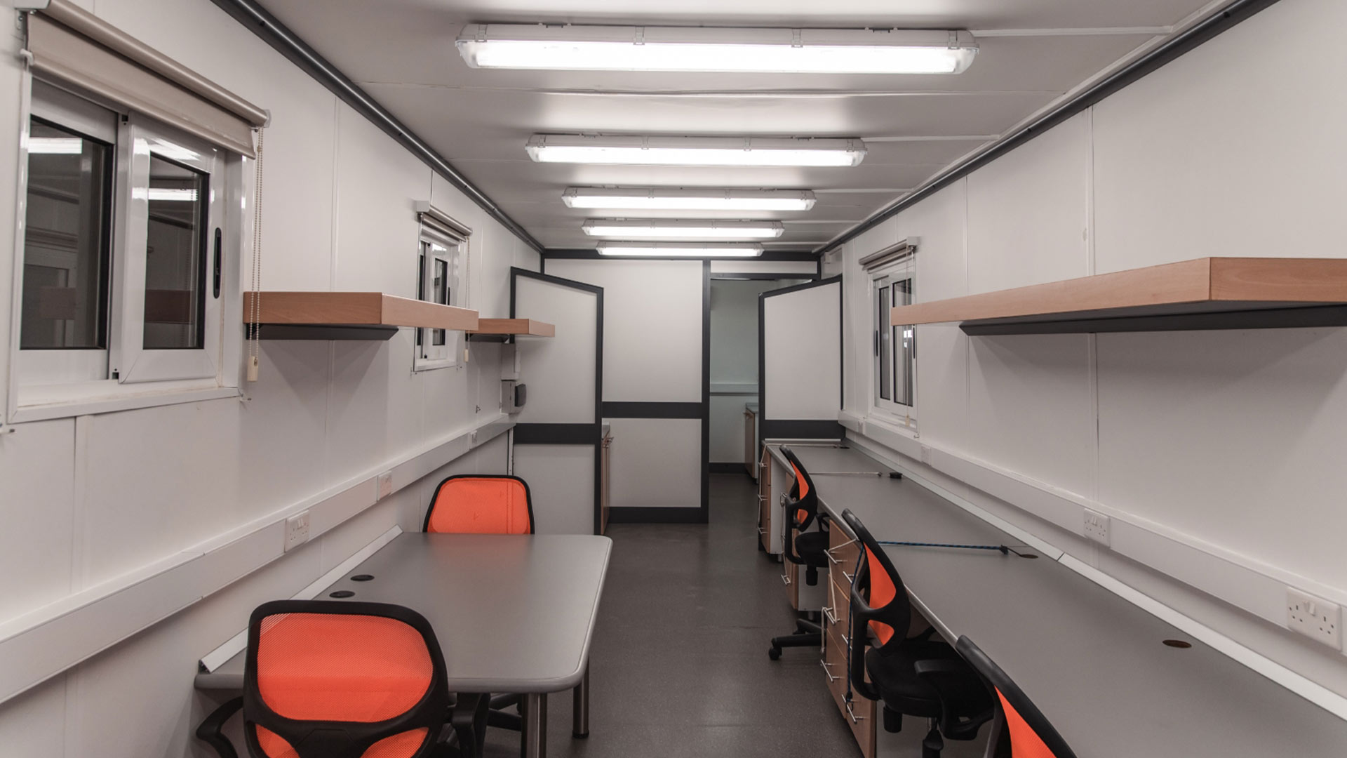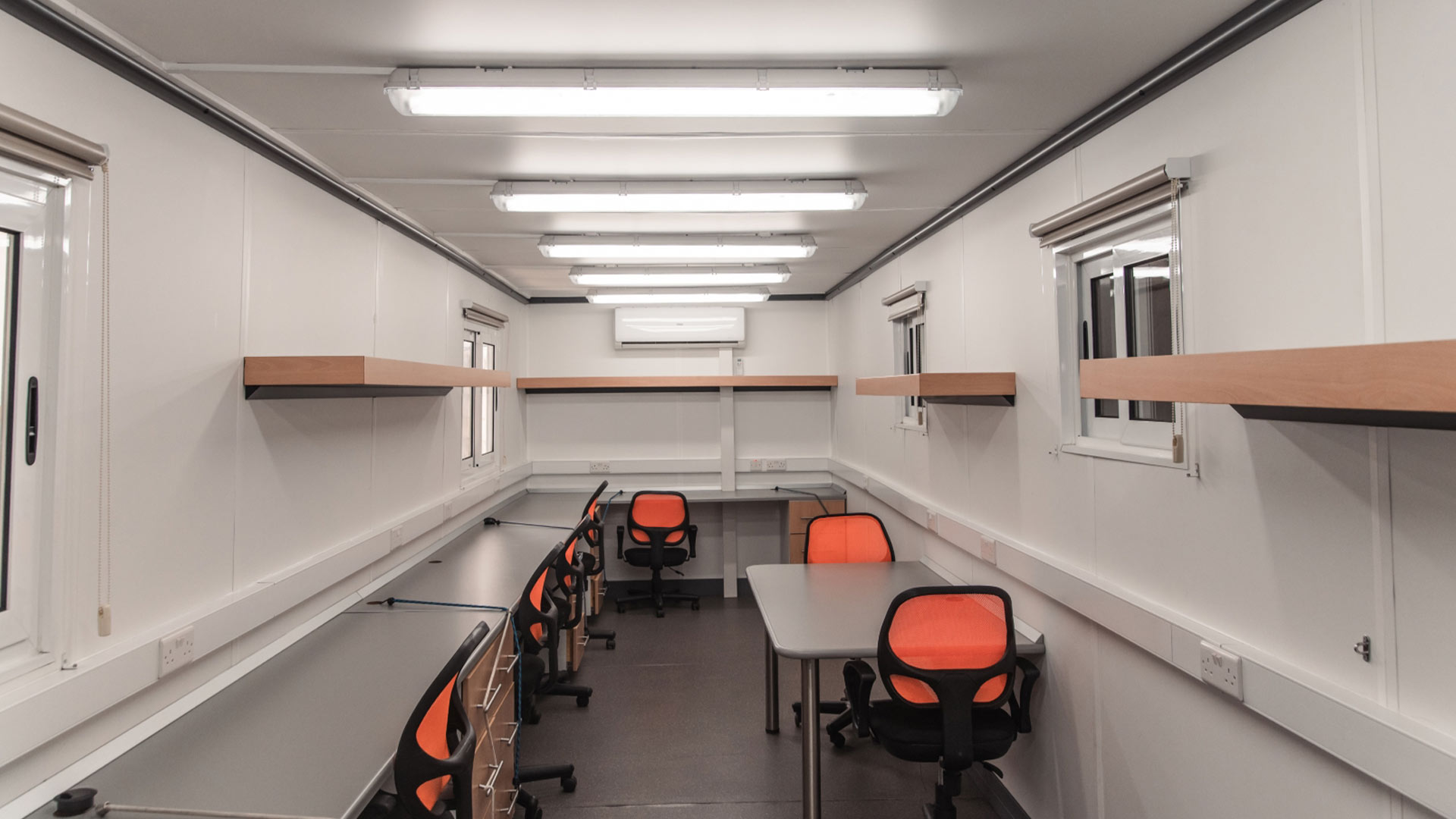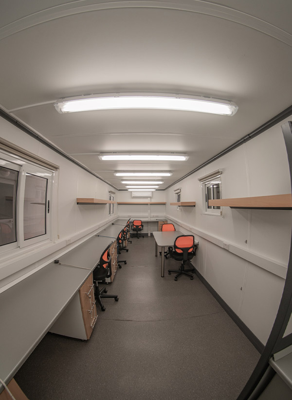 The Artic 9-Position Production Office provides a professional, comfortable, and fully functional working environment for film, TV, and event crews operating on location. Designed to support production managers, coordinators, script supervisors, and admin teams, this mobile office includes nine ergonomic workstations, multiple power points, strong lighting, shelving, and efficient air-conditioning throughout.