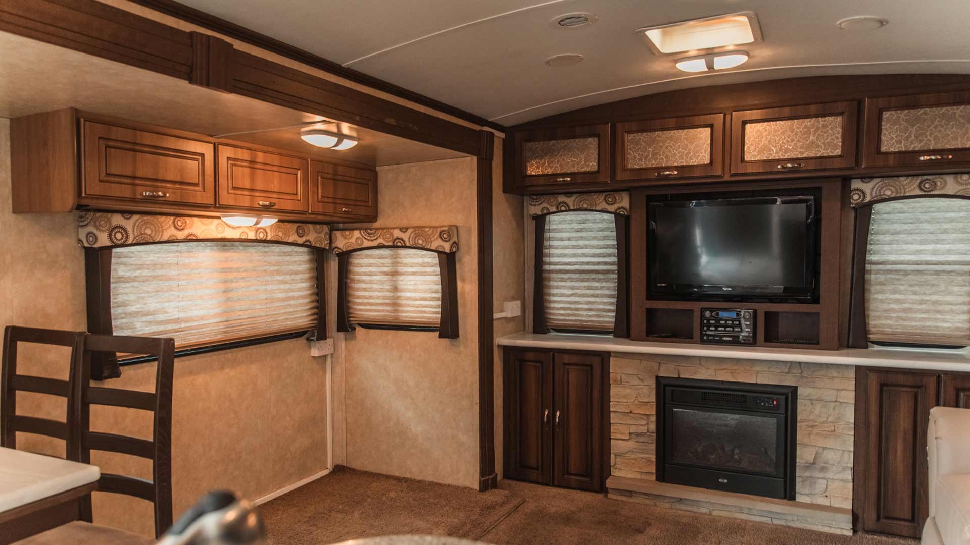 The interior includes air-conditioning, power outlets, soft lighting, and window blinds for privacy. A complete bathroom with shower, sink, and toilet ensures full functionality, allowing artists to get ready, change wardrobe, or unwind between scenes without leaving the set.